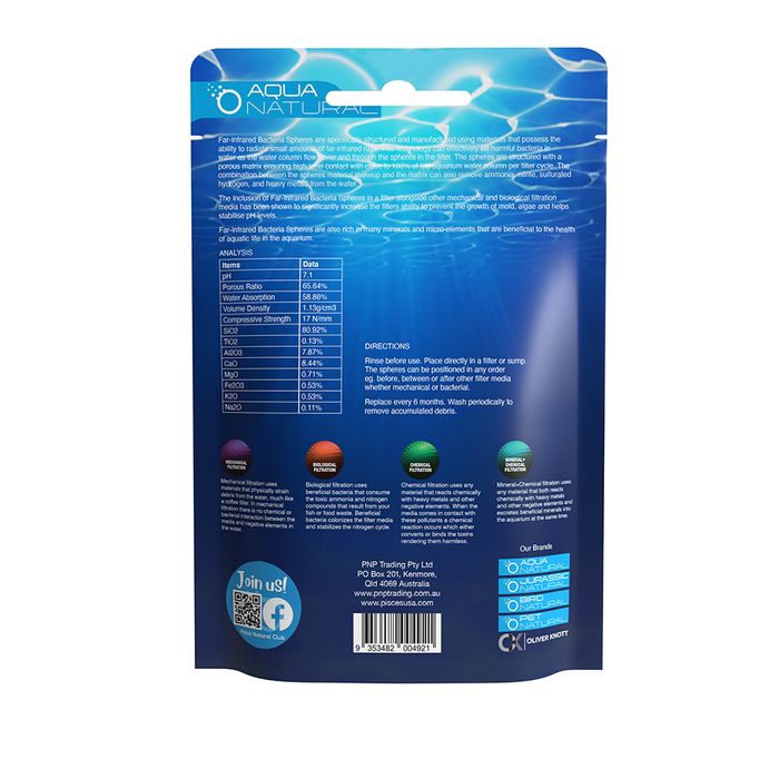 The inclusion of Far-Infrared Bacteria Spheres in a filter alongside other mechanical and biological filtration media has been shown to significantly increase the filters ability to prevent the growth of mold, algae and helps stabilise pH levels. Far-Infrared Bacteria Spheres are also rich in many minerals and micro-elements that are beneficial to the health of aquatic life in the aquarium.