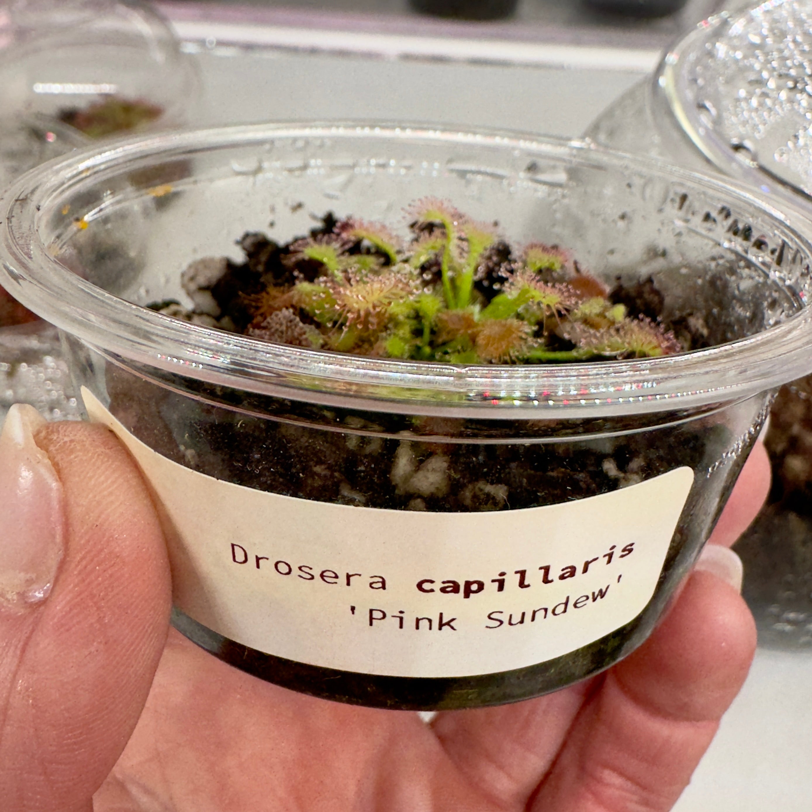 Drosera capillaris forms a low-growing, prostrate rosette up to 7 cm in diameter, with spoon-shaped leaves densely covered in glistening, sticky glandular hairs that trap small insects. In strong light, the foliage often flushes red or pink, creating a vivid display. During the warmer months, it produces delicate pink—and occasionally white—flowers on slender stems. Compact, colourful, and easy to grow, it is ideal for terrariums, bog gardens, or sunny windowsills.