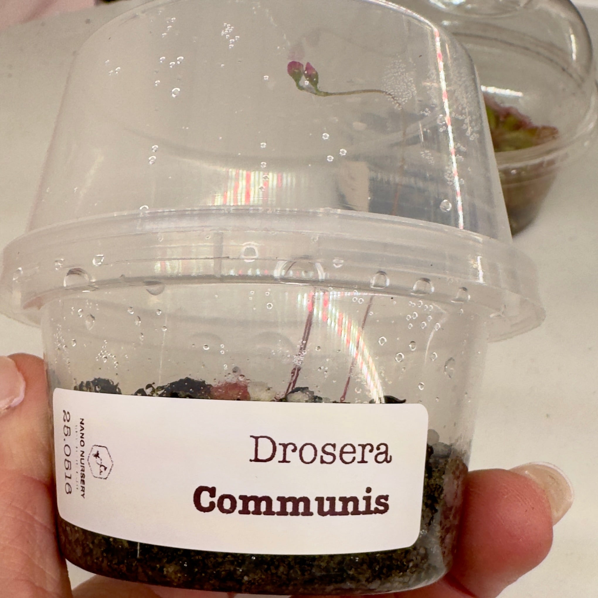 Drosera communis is a slender, rosette-forming sundew prized for its elongated green leaves lined with glistening red, sticky tentacles that trap and digest small insects. In full sun, leaves can develop pink to red tones, contrasting beautifully with its glistening mucilage droplets. During its active growth period, it produces delicate white flowers on tall stalks. Hardy, adaptable, and easy to grow, this species is ideal for beginners and makes a rewarding addition to terrariums, sunny windowsills, or outdoor bog gardens in frost-free climates.