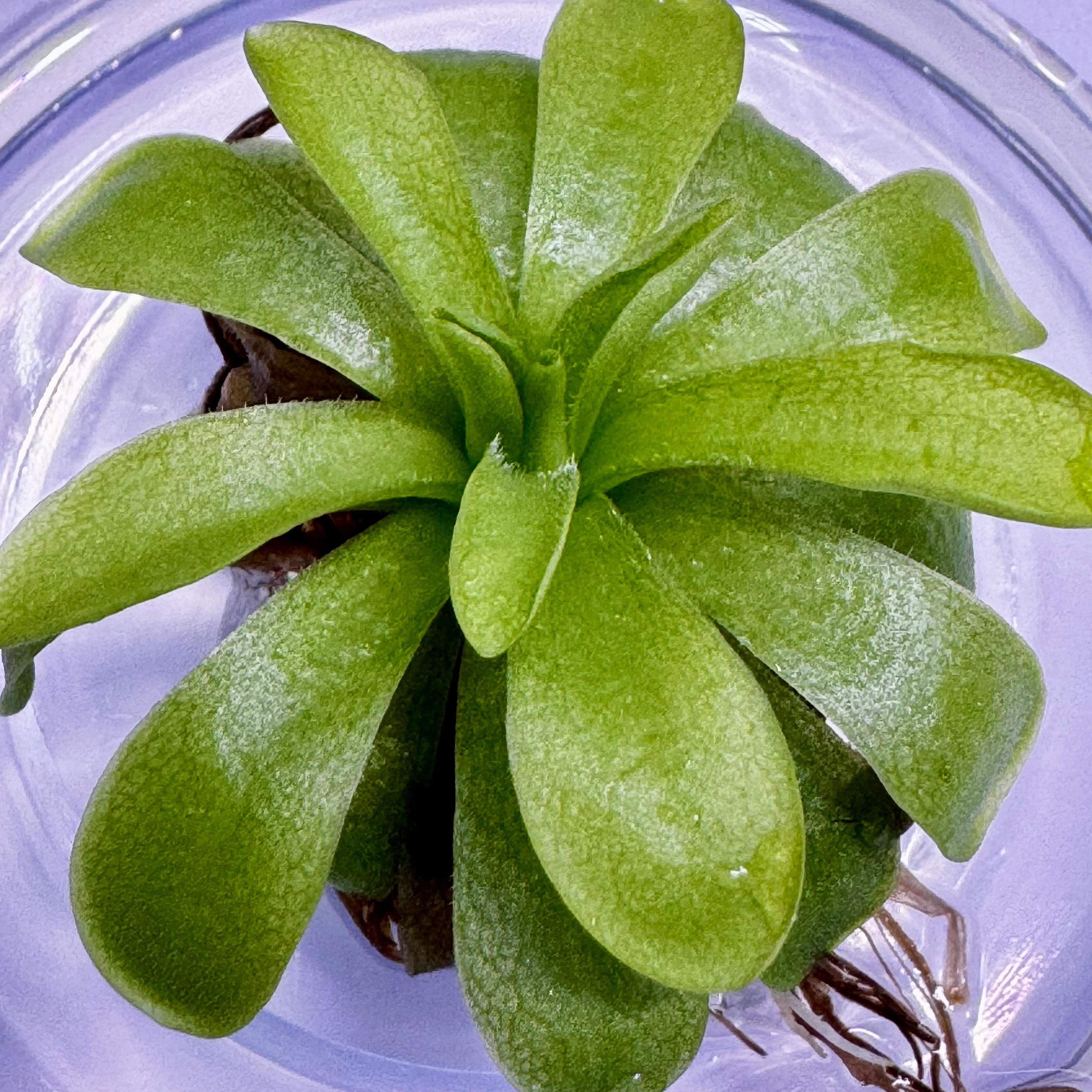 Pinguicula mesophytica is a rare, tropical butterwort that forms a compact rosette of smooth, slightly pointed leaves that are typically green with a hint of red or pink tint when grown under strong light. Leaves are sticky and glandular, designed to trap small insects like fungus gnats and fruit flies. This species is notable for thriving year-round in warmer, more humid conditions—making it distinct from temperate butterworts that require dormancy.