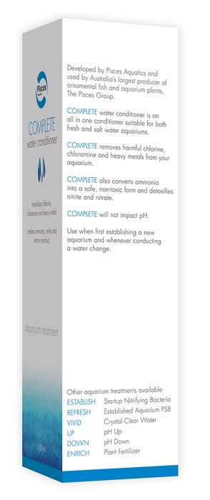 Complete water conditioner is an all in one conditioner suitable for both fresh and salt water aquariums. Complete removes harmful chlorine, chloramine and heavy metals from your aquarium. Complete also converts ammonia into a safe, non-toxic form and detoxifies nitrite and nitrate. Complete will not impact pH. Use when first establishing a new aquarium and whenever conducting a water change.