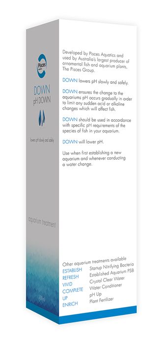 Down lowers pH slowly and safely. Down ensures the change to the aquariums pH occurs gradually in order to limit any sudden acid or alkaline changes which will affect fish. Down should be used in accordance with specific pH requirements of the species of fish in your aquarium. Down will lower pH.