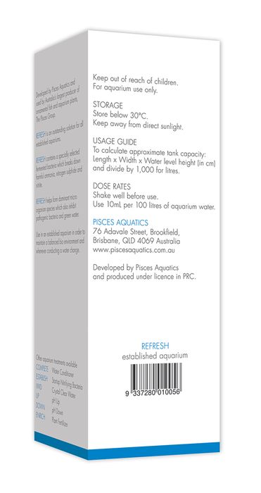Refresh is an outstanding solution for all established aquariums. Refresh contains a specially selected fermented bacteria which breaks down harmful ammonia, nitrogen sulphide and nitrite. Refresh helps form dominant micro organism species which also inhibit pathogenic bacteria and green water. Use in an established aquarium in order to maintain a balanced bio environment and whenever conducting a water change.