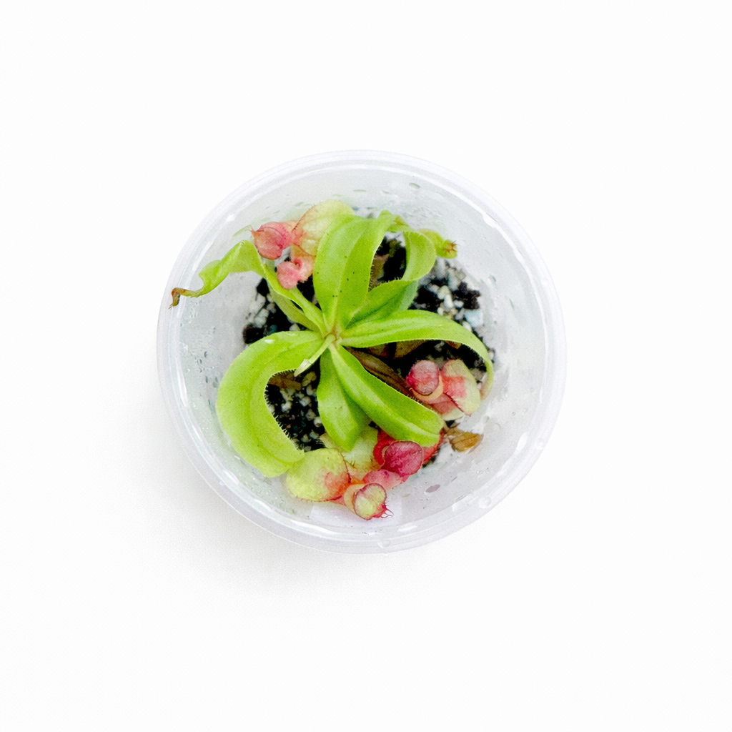 Each transparent carnivorous cup (5 cm diameter x 7 cm height) contains a juvenile carnivorous plant freshly transitioned from tissue culture.