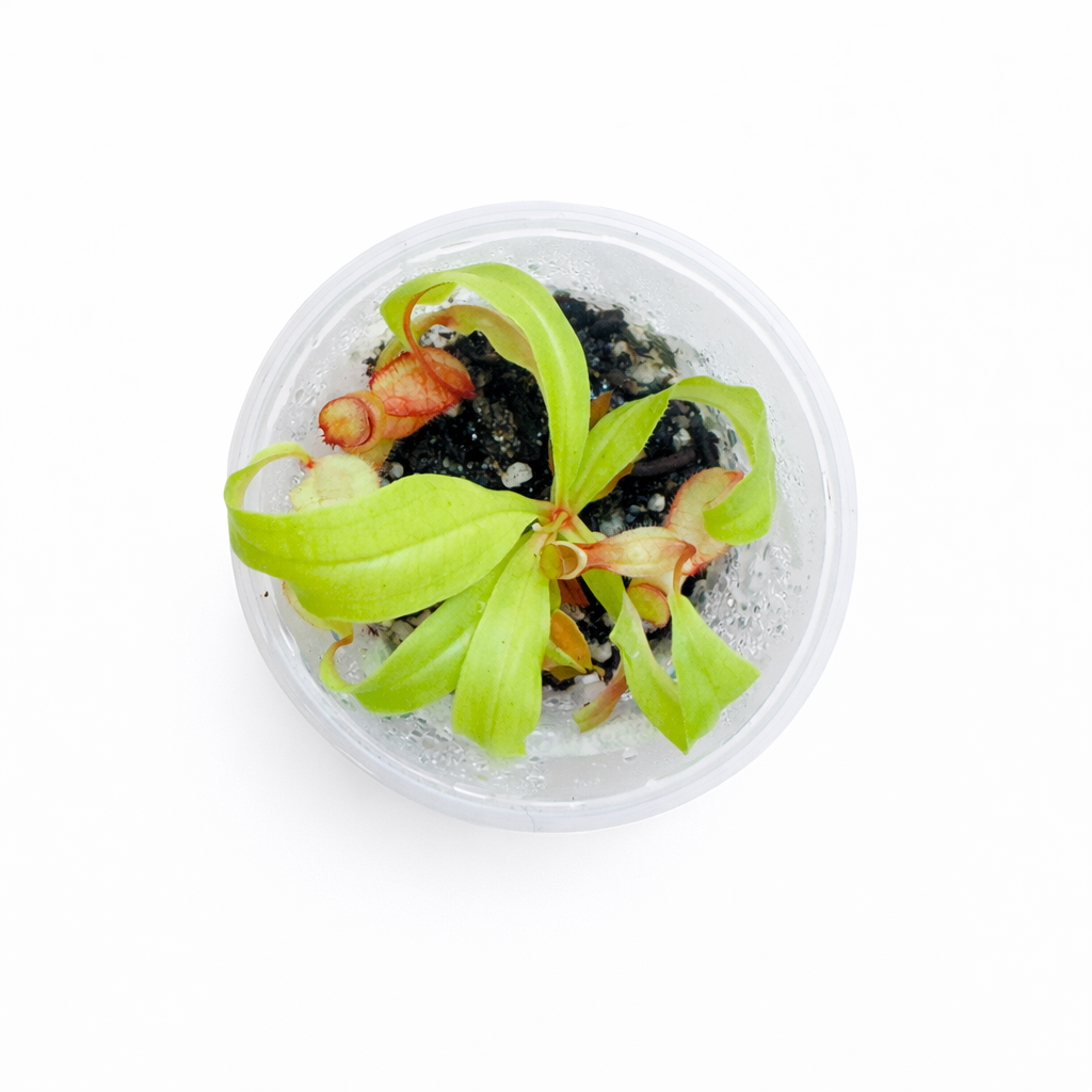 Nepenthes viking is a bold and eye-catching lowland tropical pitcher plant, best known for its squat, globular pitchers that resemble tiny Viking helmets. The pitchers are often deep red to burgundy, sometimes striped or speckled, with wide peristomes that make them stand out dramatically against their green foliage. Emerging from Gel Cup, this plant starts as a compact rosette producing miniature but striking pitchers that already showcase its unique, round-bodied form.