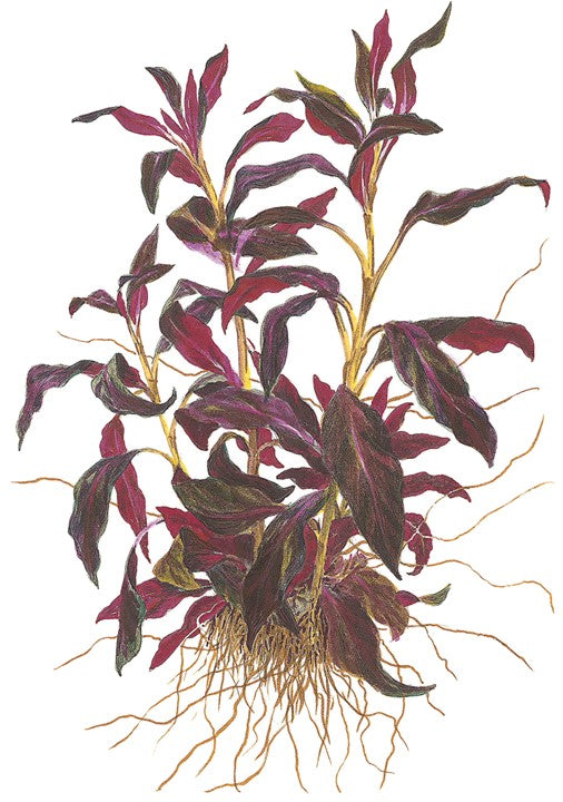 Notable for its intense red coloration, this stem plant adds dramatic contrast to the aquascape, best suited for the background.