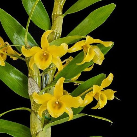 The Dendrobium fredricksianum is a captivating orchid native to Thailand, Malaysia, and Cambodia, known for its vibrant and unique blooms. This beautiful plant features clusters of bright yellow flowers with delicate, fringed edges, often accented with a contrasting deep orange or red center. The blooms are not only visually stunning but also long-lasting, making this orchid a delightful addition to any indoor space. With its slender, arching stems and lush green leaves, the Dendrobium fredricksianum adds a touch of tropical elegance to any plant collection. It thrives with minimal care, making it ideal for both novice and experienced orchid enthusiasts.