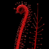 Elegant, thread-like leaves; entirely deep red, covered in glistening dew